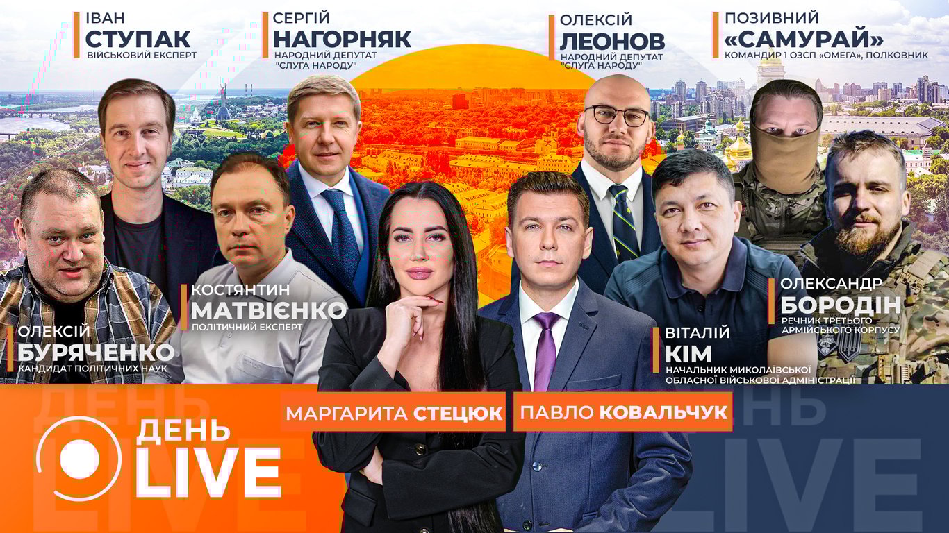 Гостями ефіру День.LIVE стали кандидат політичних наук Олексій Буряченко, військовий експерт Іван Ступак, політичний експерт Костянтин Матвієнко, нардеп Сергій Нагорняк, речник Третього армійського корпусу Олександр Бородін, начальник Миколаївської ОВА Віталій Кім та нардеп Олексій Леонов.