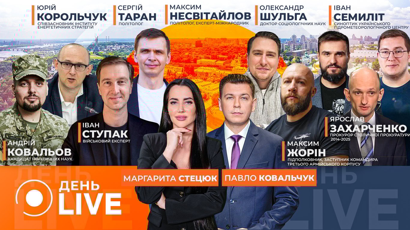 Гостями эфира День.LIVE стали кандидат политических наук Андрей Ковалев, военный эксперт Иван Ступак, соучредитель Института энергетических стратегий Юрий Корольчук, политолог Сергей Таран, политолог Максим Несвитайлов, почетный председатель ВОО "Правовое равенство" Ярослав Захарченко, заместитель командира Третьего армейского корпуса Максим Жорин, доктор социологических наук Александр Шульга и синоптик Укргидрометцентра Иван Семилит.